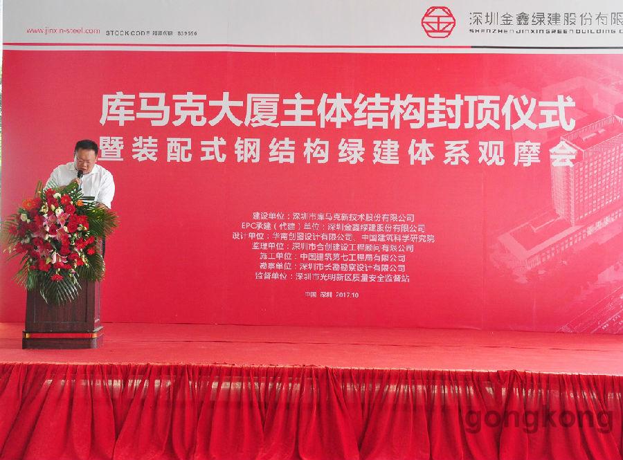 深圳市庫馬克新技術(shù)股份有限公司董事長李瑞常、深圳金鑫綠建股份有限公司董事長張楓、中國建筑第七工程局南方公司副總經(jīng)理司翔、深圳市節(jié)能協(xié)會榮譽(yù)會長郝英吉、中國建筑科學(xué)研究院深圳分院總工程師劉建、深圳市合創(chuàng)建設(shè)工程顧問有限公司副總經(jīng)理胡志毅出席封頂儀式并致辭致賀詞。庫馬克大廈建設(shè)項目,管理一流、資源節(jié)約、環(huán)境友好、建設(shè)過程節(jié)水、節(jié)材、無揚(yáng)塵,庫馬克大廈按綠色三星標(biāo)準(zhǔn)建設(shè)。